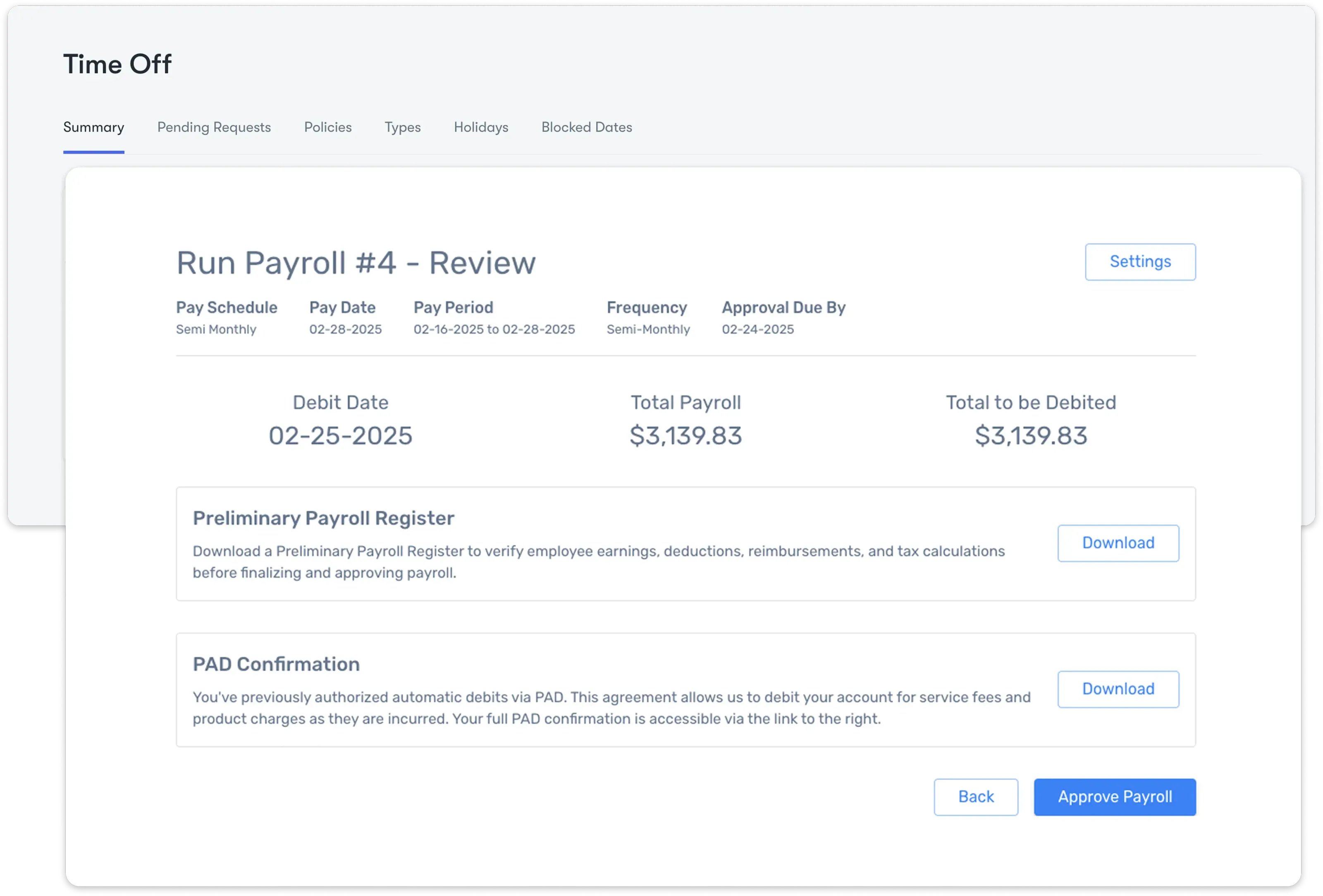 Hitting “Run” is a big milestone! You made it… To your first payroll. Double check the numbers. Make sure you understand the high level deductions in the summary provided by your payroll software. If there is an option provided by the software provider, ask them to review before you hit run.
